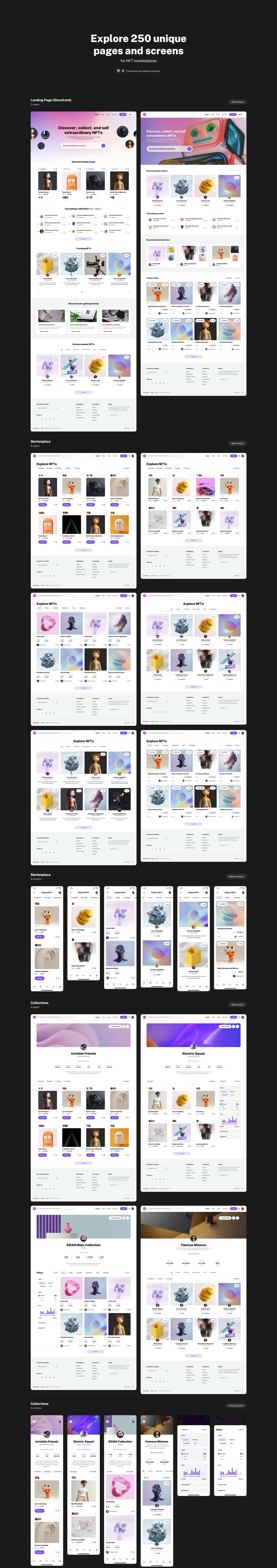 我们设计了250个独特的网页和移动应用屏幕。此外,你可以使用我们的一套320个矢量UI套件符号来建立你自己的数字市场。所有的符号和对象都是基于矢量的,易于编辑。我们使用了主要的谷歌字体和Material Icon字体来制作文本样式和图标。请看完整的预览,仔细看看购买后你将得到的NFT网络和移动市场的所有艺术板。
