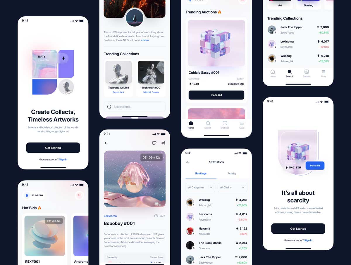 Nifty 是一个高级和高质量的 NFT 市场应用程序 UI 工具包,具有 80 个高质量屏幕,并且在 Figma 中易于使用。 提供明暗主题。