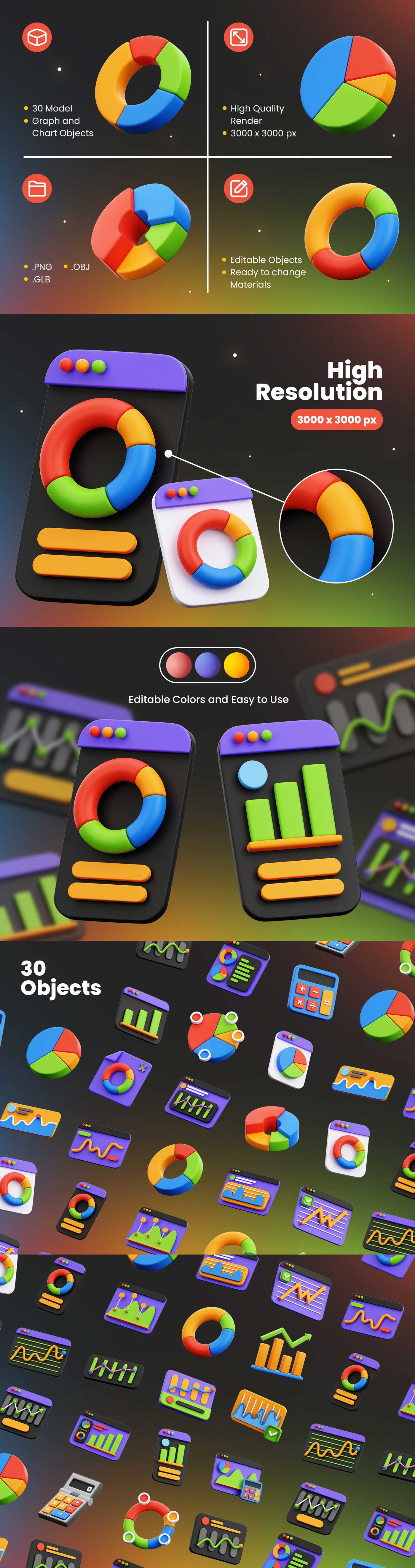 30个3D图形和图表设计素材(Graph and Chart 3D Objects),图形和图表 3D 对象可用于设计需求、动画、网页设计、UI 设计、演示幻灯片、海报等。