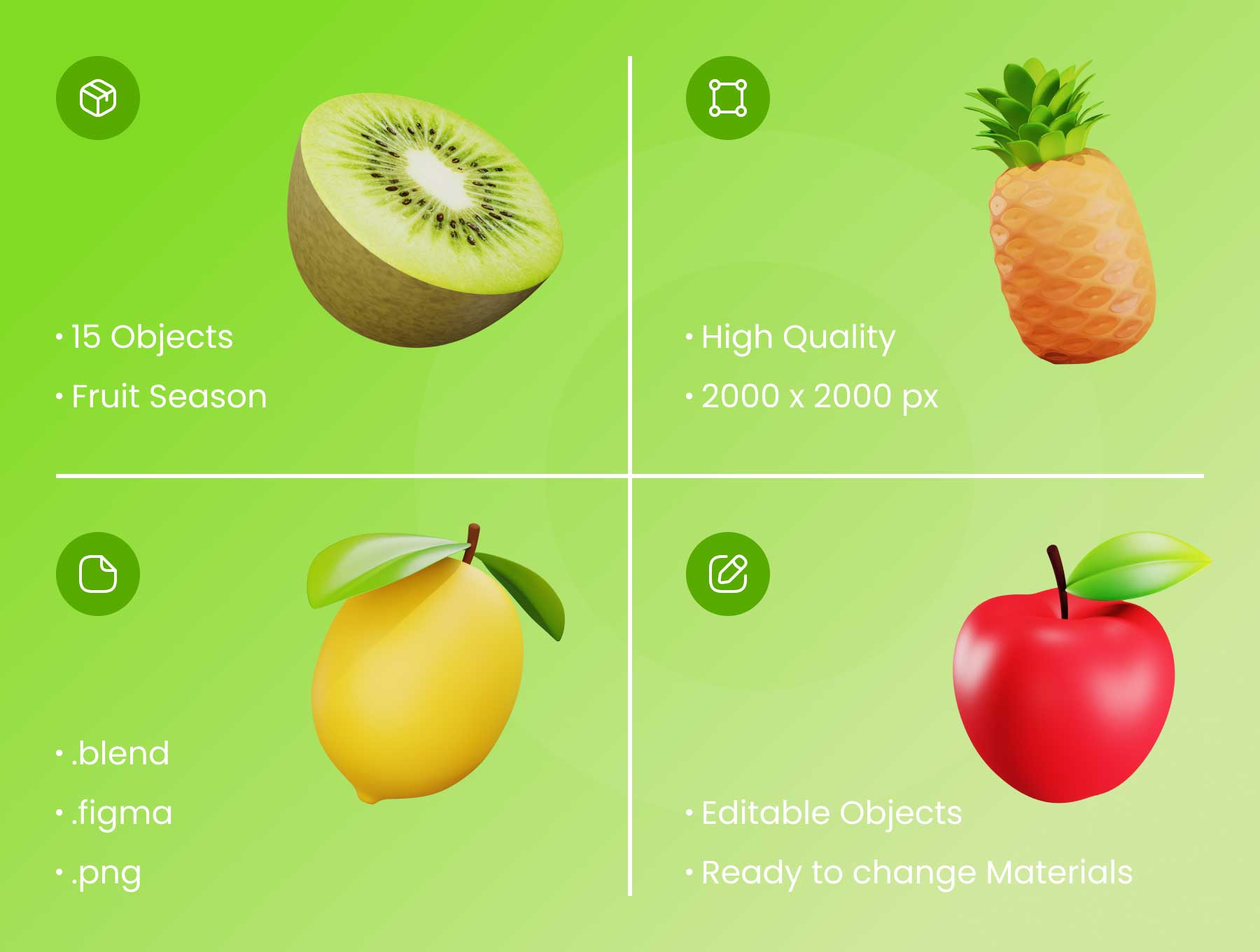 Fruit 3D水果插画设计 Figma、blender素材(Fruit 3D Illustration),Fruit 3D Illustration包含15个3D水果插画素材,每个素材都分层设计的,可以非常容易的进行编辑和扩展,同时可以随意更改素材的颜色。该UI素材包可用于网页设计制作及移动应用程序设计制作。
